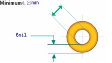 | 过孔单边焊环 | ≥6mil | 如导电孔或插件孔单边焊环过小,但该处有足够大的空间时, 则不限制焊环单边的大小; 如该处没有足够大的空间且有密集走线, 则最小单边焊环不得小于6mil。如右图 |